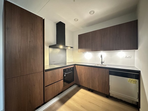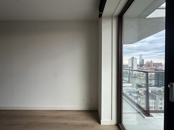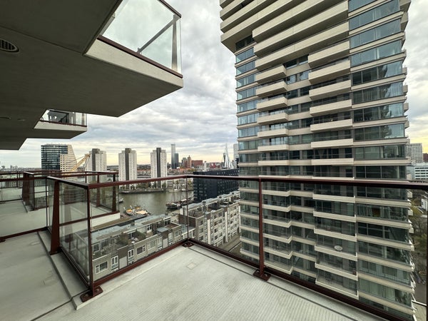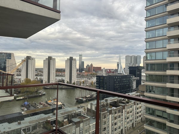 Entree op de begane grond via de gezamenlijke hal met brievenbussen, bellentableau en liftinstallatie. 14e verdiepingJe komt binnen in de gang met toegang tot de interne berging, separaat toilet, badkamer en de woonkamer met open keuken.De lichte woonkamer is modern afgewerkt met witte muren en een lichte PVC vloer. De woonkamer heeft veel natuur lichtinval dankzij de grote raampartijen en toegang tot het ruime balkon, vanwaar u geniet van een indrukwekkend uitzicht op Leuvehaven, de Erasmusbrug en de Euromast. De keuken is strak afgewerkt met donkere, houttint kastjes en is voorzien van inbouwapparatuur zoals een vaatwasser, combi-oven, koelkast, vriezer, inductiekookplaat en afzuigkap.De slaapkamer bereik je vanuit de woonkamer en heeft eveneens toegang tot het balkon en biedt volop lichtinval.De badkamer is modern betegeld en voorzien van een inloopdouche, wastafel met spiegel en een separaat toilet.De woning wordt gemeubileerd opgeleverd in stijlvolle, eigentijdse inrichting. Een aparte berging met aansluiting voor wasmachine en droger is aanwezig.Let op: de foto’s geven alvast een sneak peek van de huidige afwerking. De inrichting en afstyling volgen spoedig.