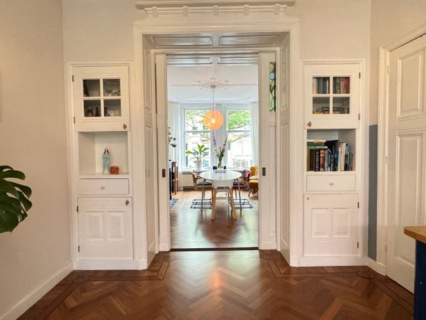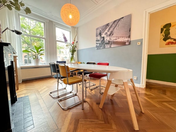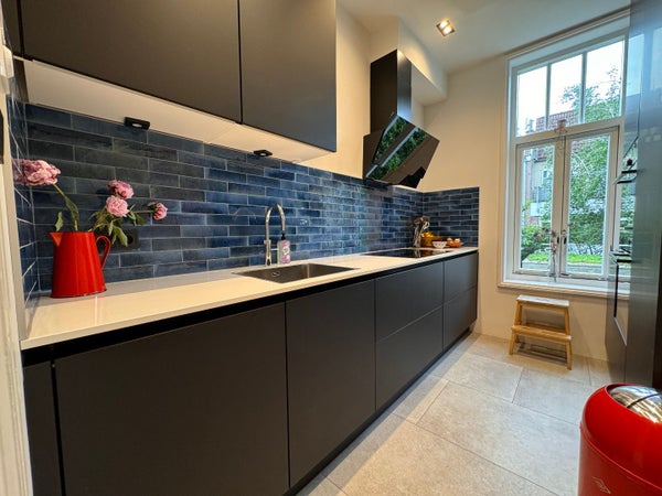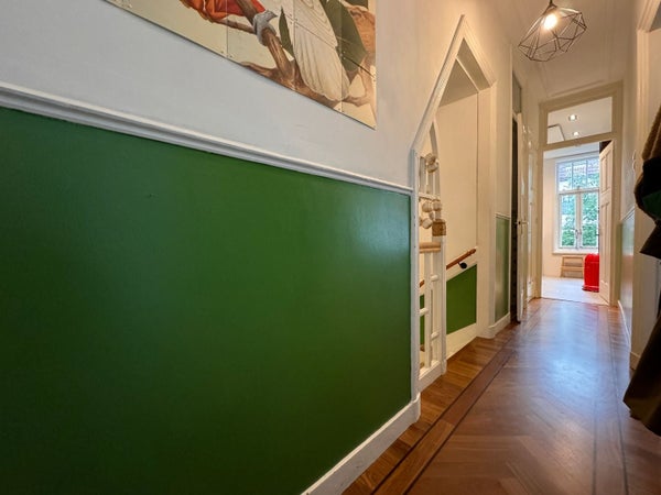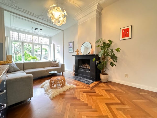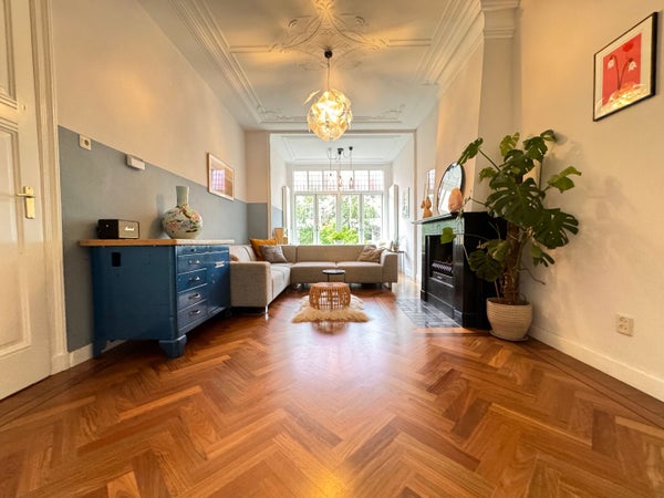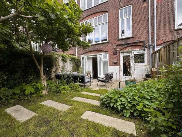 Verdeeld over twee lagen bevinden zich een zeer ruime woonkamer en-suite, keuken en toilet op de eerste etage. In het souterrain zijn 3 slaapkamers, een badkamer en de toegang tot de achtertuin aanwezig. De tuin is voorzien van een tuinhuis met berging en extra werkkamer. Door de opzet van het woonblok voelt de tuin als een oase van rust in de hectiek van de stad.