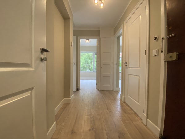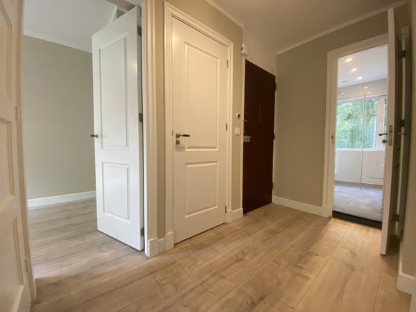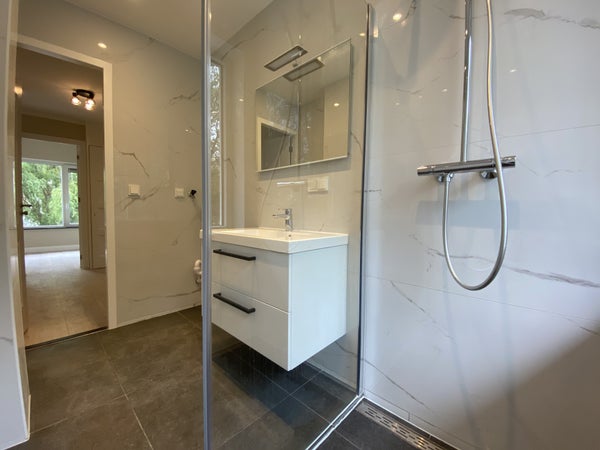 Via de gemeenschappelijk en afgesloten entree komt u met de trap op de 2e etage. Aangekomen in de ruime hal van de woning treft u rechts een separaat toilet met fontein en links de luxe en volledig betegelde badkamer welke is voorzien van een inloopdouche met regendouche, moderne wastafel met lades, een spiegelkast en een handdoekradiator. Tevens bevindt zich hier de wasmachine-aansluiting.