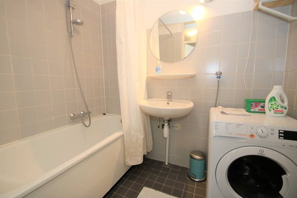 De badkamer is ruim en verzorgd uitgevoerd en beschikt over een comfortabel ligbad met douche, een wastafel met spiegel en aansluitingen voor de wasmachine. De ruimte biedt voldoende bewegingsvrijheid en praktische indeling, waardoor comfort en functionaliteit hier samenkomen.