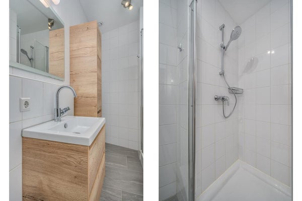 Moderne en volledig betegelde badkamer met een ligbad, aparte douche, wastafel en designradiator. Het toilet is in dezelfde stijl uitgevoerd en voorzien van een hangend toilet met handwasbak. De ruime berging met wasmachine-aansluiting, opstelling voor de centrale verwarmingsketel en meterkast.