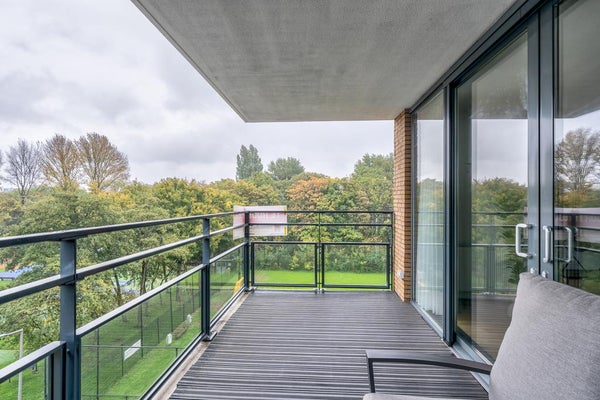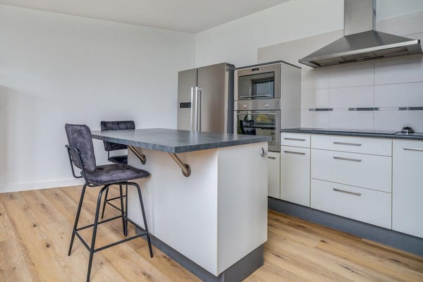 Entree in de hal met toegang tot alle ruimtes. Ruime en lichte woonkamer van ca. 28m2 met schuifdeuren naar het balkon. Het balkon is ongeveer 12m2 en biedt een geweldige plek om te verblijven. Via de woonkamer bereik je de keuken van ca. 24m2 met een mooi uitzicht op het grasveld vanuit het Franse balkon. De neutrale keuken in gebroken wit is voorzien van een werk-eiland, 4-pits keramische kookplaat, RVS afzuigkap, oven, vaatwasser en magnetron.