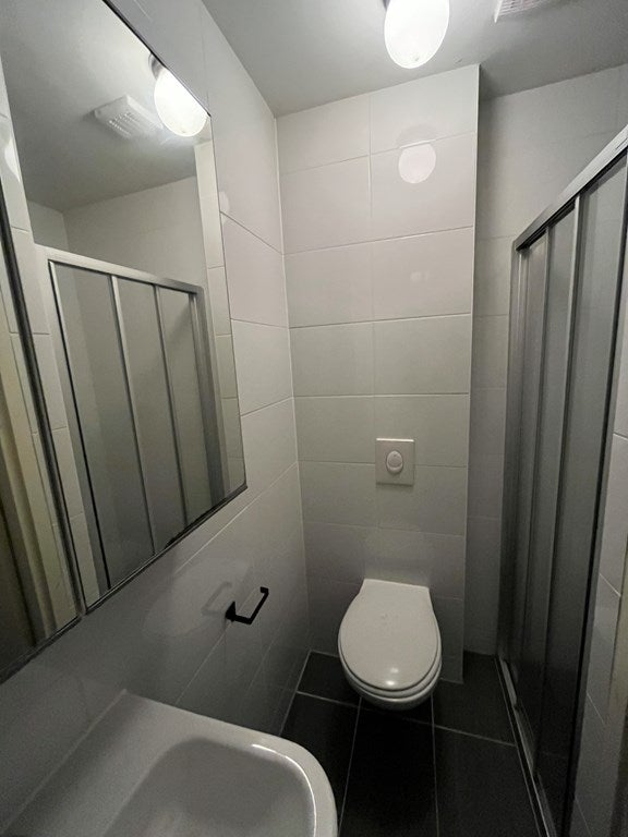 De badkamer is voorzien van een douche, toilet en een wastafelmeubel met spiegel.