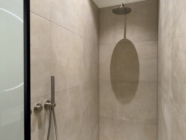 Badkamer ligt aan de overkant van de gang, badkamer is zeer luxe, voorzien van een inloop douche, dubbele wastafel en een design radiator.