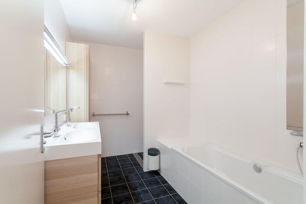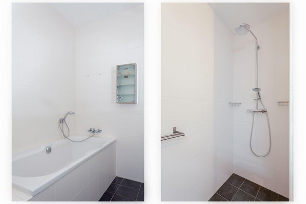 Luxe badkamer met ligbad, ruime inloopdouche met thermostaatkraan, meubel met 2 wastafels en kast.
