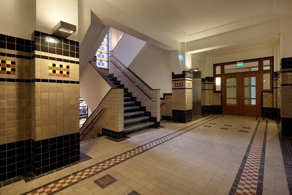 Majestueuze centrale hall met hernieuwde deurpartijen, mozaïekvloer, glas-in-lood raampartijen, monumentaal trappenhuis en toegang tot de liften en de parkeergarage en fietsenstalling.