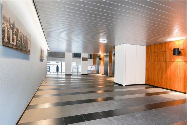 Afgesloten en representatieve entree met brievenbussen, bellentableau en intercom. Vanuit de luxe ontvangsthal zijn het trappenhuis en de drie liften bereikbaar.