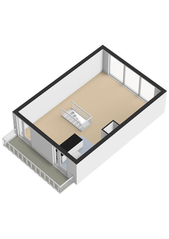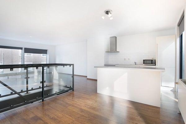De trap leidt naar de royale en lichte leefruimte. Dankzij de speelse trapopening met glazen balustrade ontstaat een duidelijke scheiding tussen het zit- en eetgedeelte. De luxe open keuken is compleet uitgerust met een vaatwasser, koelkast, vriezer, oven en keramische kookplaat. Vanuit zowel de keuken als het eetgedeelte is er directe toegang tot het brede, zonovergoten terras. De grote raampartijen zorgen voor een overvloed aan daglicht en geven de ruimte een open en ruimtelijk karakter.