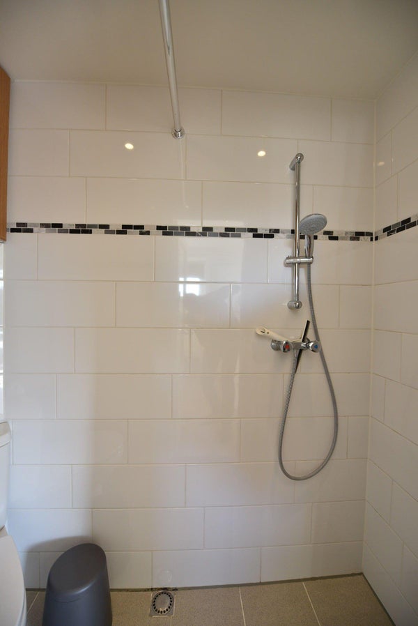 De badkamer is via een deur te bereiken. Hier kan men comfortabel onder een ruime douche staan en is hier het toilet te vinden.