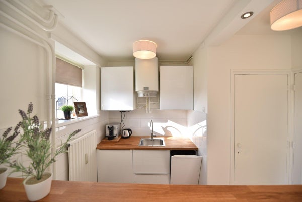Aan de andere kant van de studio is de keuken gesitueerd. Ook hier heeft de eigenaar geen detail vergeten! Denk aan de ingebouwde keramische kookplaat, koelkast en zelfs de vaatwasser is aanwezig.
