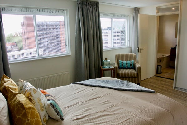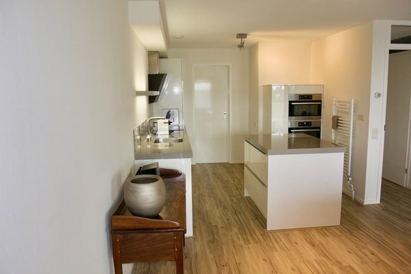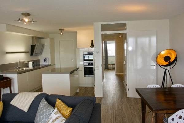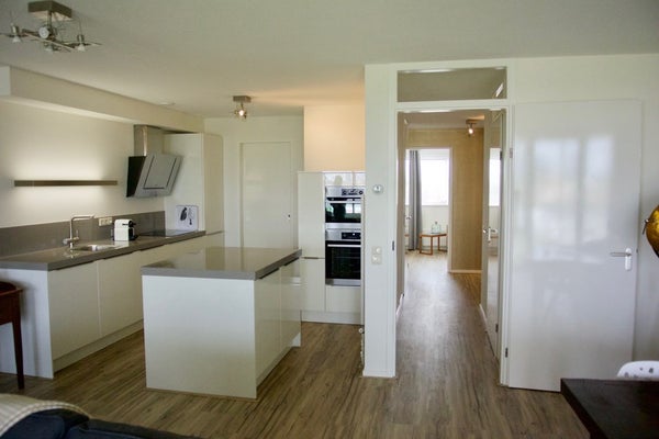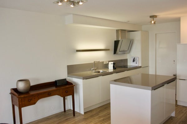 Kom in de woonkamer die veel licht biedt en een prachtig uitzicht op de skyline van Rotterdam. Je hebt een L-vormige bank, televisie en een leuke eetruimte. De keuken is verbonden met de woonkamer met kookeiland en veel kastruimte. De keuken heeft een grote koelkast met vriesvak, een combinatie van een dubbele oven en magnetron, een vaatwasser en kookplaat.