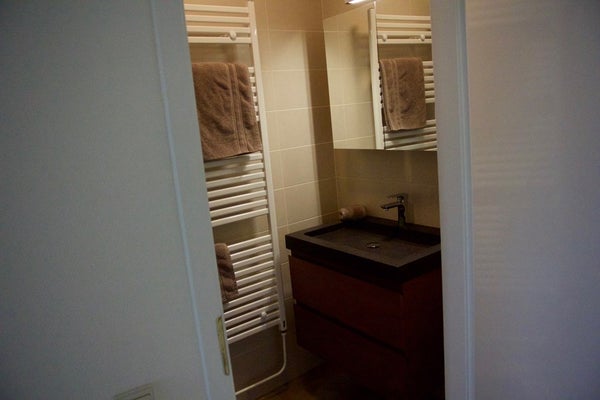 7e verdieping: stap in de gang waar je voldoende ruimte hebt om je schoenen en jassen op te bergen. Aan de rechterkant heb je een ruime slaapkamer met een grote kast en een comfortabel kingsize bed. Naast de slaapkamer heb je de badkamer, volledig uitgerust met een toilet, aparte douche, badkuip en dubbele wastafel. Voor gasten is er een tweede badkamer met douche en wastafel beschikbaar, evenals een apart toilet met een kleine wastafel.