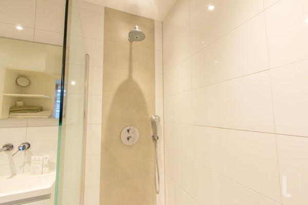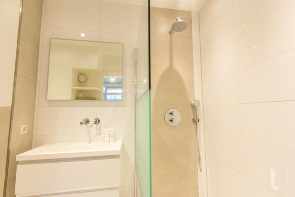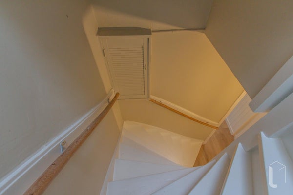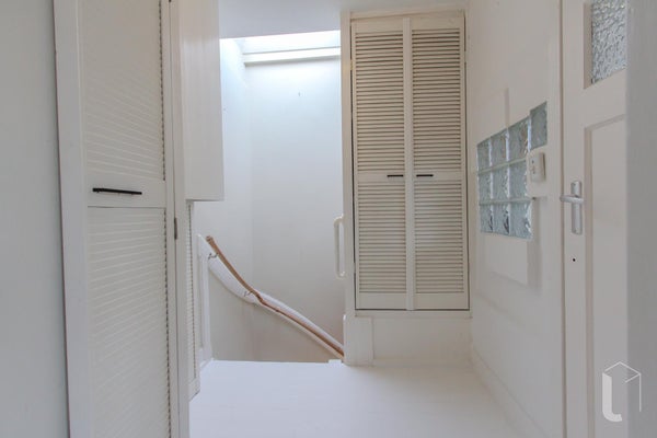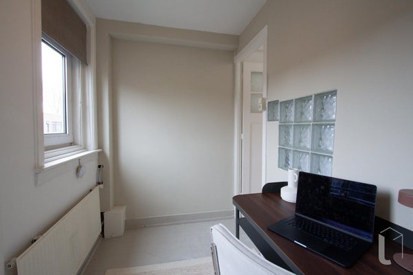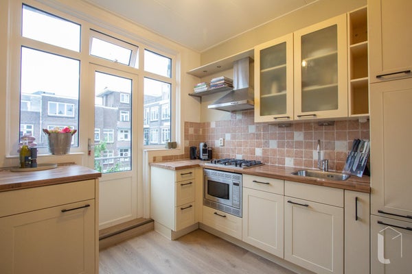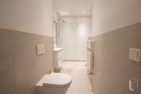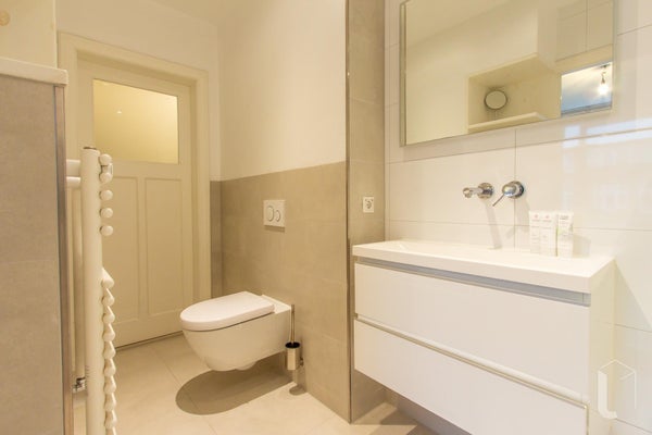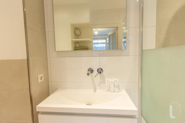De keuken aan de achterzijde is volledig uitgerust met een koelkast met vriesvak, oven, vaatwasser, gasfornuis en afzuigkap. Vanuit de keuken heb je toegang tot het balkon met uitzicht op de groene binnentuinen. De badkamer bevindt zich op de tweede verdieping.