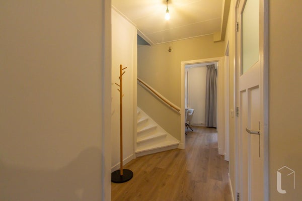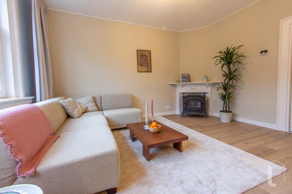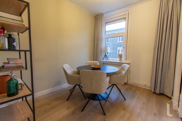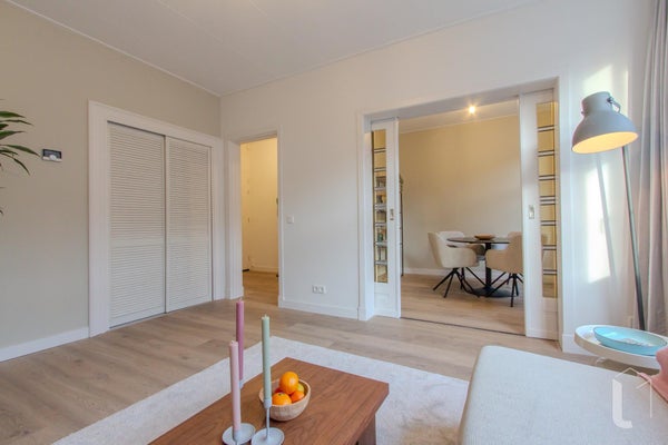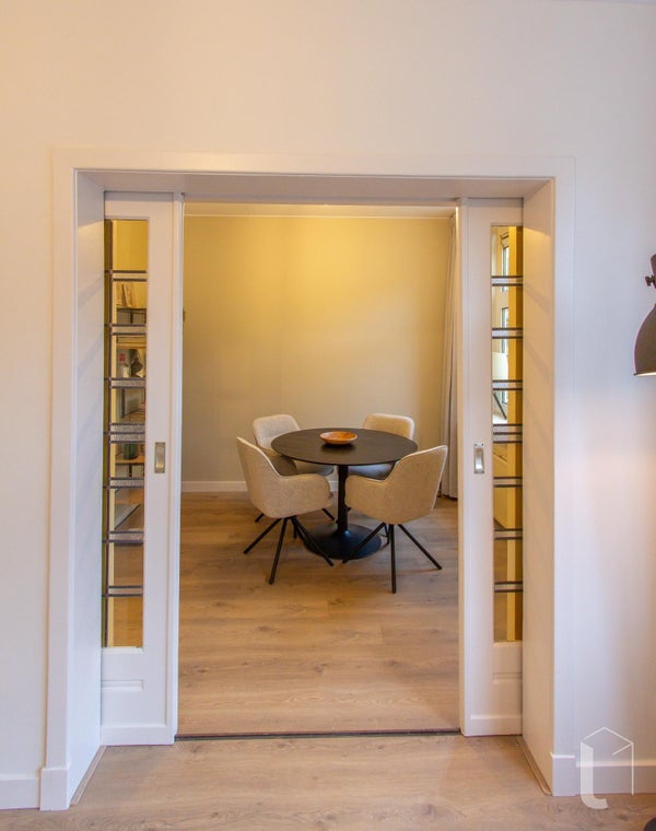 Via de gezamenlijke trapopgang bereik je de entree van het appartement op de tweede verdieping. Vanuit de hal leidt een inpandige trap naar de woonverdieping op de derde etage. De lichte woonkamer bevindt zich aan de voorzijde en is ingericht met een comfortabele bank. Aangrenzend ligt de eetkamer, die middels ensuite deuren kan worden afgesloten.