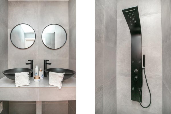De grote slaapkamer is vanuit de hal via de schuifdeuren in de woonkamer toegankelijk. Ook hier treft u het hoge plafond met een ornament. De tweede slaapkamer is ideaal in te richten als werk of kastenkamer. De badkamer is uiteraard ook weer luxe en ingericht met twee waskommen en kranen en er is een inloopdouche met thermostaatkraan, hand- en regendouche. Het toilet is separaat, maar wel in dezelfde stijl uitgevoerd als de badkamer: geheel betegeld in grijze kleurstelling. De aansluiting voor de wasmachine bevindt zich in een inbouwkast.