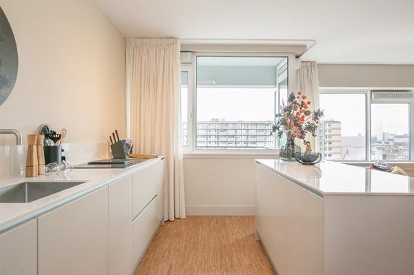Daarnaast is er een aparte bijkeuken met wasmachine en droger. Het appartement beschikt over een hoogwaardige kurkvloer met vloerverwarming, moderne verlichting zoals te zien op de foto's, en in de slaapkamer zijn duo rolgordijnen (verduisterend + lichtdoorlatend) aanwezig. Alle ruimtes zijn voorzien van blinds, rolgordijnen, gordijnrails en gordijnen.