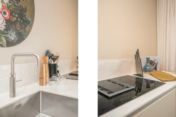 De moderne keuken is uitgerust met hoogwaardige Siemens inbouwapparatuur: kookplaat, koelkast, vaatwasser, combimagnetron en een Quooker-kraan.