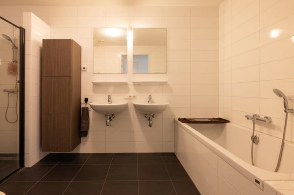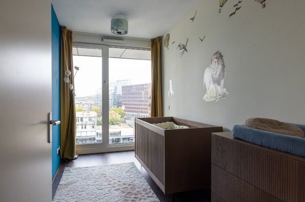 5e verdieping Via de trap in de woonkamer kunt u naar de 5e verdieping. Slaapkamer 1 is voorzien van een 2-persoonsbed met linnenkast. Slaapkamer 2 is ruim opgezet en voorzien van een slaapbank. De derde slaapkamer is momenteel ingericht als kinderkamer. De luxe badkamer is voorzien van een ligbad, douche, wastafelmeubel met spiegel en design radiator. Verder is er een apart toilet en een bijkeuken met wasmachine en droger. Het gehele appartement is voorzien van vloerverwarming. Er worden nieuwe bedden geplaatst in slaapkamer 1 en 2. Slaapkamer 3 wordt ingericht als kantoor.*ook geschikt voor een student/ studentenstel.