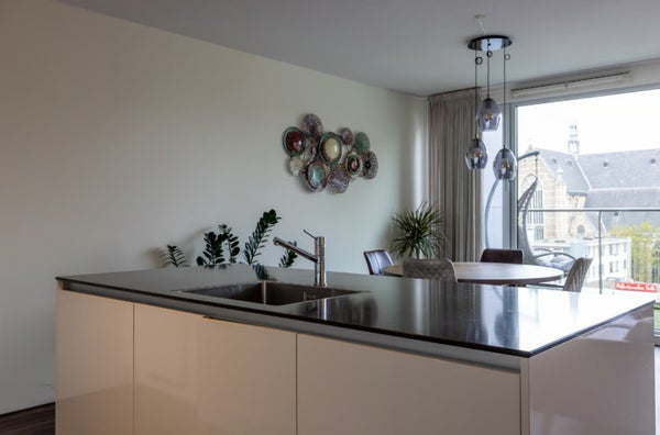 Indeling: Op de begane grond gezamenlijke entree met toegang tot de lift en het trappenhuis. 4e verdieping Op de 4e verdieping bevindt zich de entree van het appartement. U komt binnen in een zeer ruime hal met toegang tot alle vertrekken. De woonkamer heeft grote raampartijen, welke zorgen voor een lichte woonkamer met een mooi uitzicht over het stadscentrum. De woonkamer is voorzien van een hoekbank, 2 fauteuils, een dressoir, tv met meubel en opbergruimte. Middels de woonkamer is de luxe open keuken bereikbaar en beschikt over diverse inbouwapparatuur van het merk Siemens, waaronder een koelkast, vriezer, inductie kookplaat, combi-magnetron, vaatwasser en Quooker kraan.