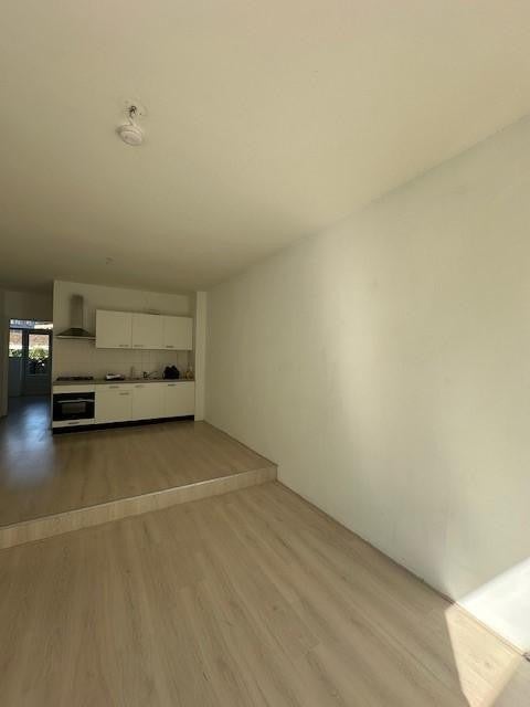 • Woonkamer met nette laminaatvloer, gladde stucwerk muren en een keurig open keuken voorzien van een 4-pits gasfornuis, afzuigkap, oven en koelkast met vriesvak