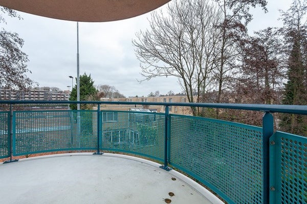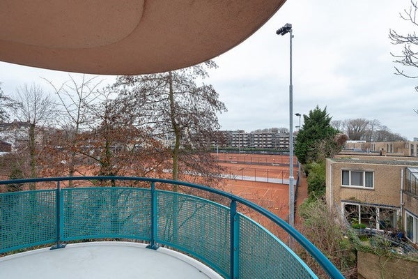 Eerste etage: gang met aangrenzende vertrekken. Meterkast, apart toilet en bergkast met stookvoorziening en mechanische ventilatie. Woonkamer met half open L-vormige keuken (vaatwasser, oven, koel-vriescombinatie, gaskooktoestel) met voldoende kastruimte. Driekwart rond balkon met zicht over groenvoorzieningen en tennisbanen. De badkamer heeft een strakke grijs-witte uitstraling en beschikt over een inloopdouche met hand- en stortdouche en wastafelmeubel met spiegel. De woning heeft 2 slaapkamers waarvan de grootste is voorzien van een ruime ingebouwde kledingkast met spiegeldeuren.