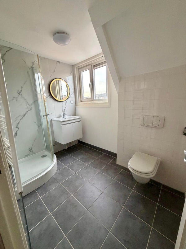 De badkamer is uitgevoerd met marmerlook wandafwerking en voorzien van een douche met glazen schuifwand, wastafelmeubel, toilet en designradiator.