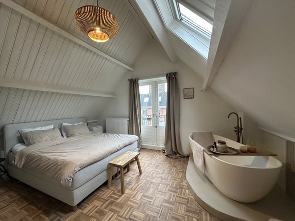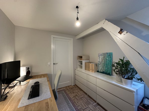 2e verdiepingOp de tweede verdieping geeft de overloop toegang tot alle vertrekken.Aan de achterzijde bevindt zich de hoofdslaapkamer met tweepersoonsbed, ruime kastenwand en een vrijstaand bad, met toegang tot het balkon. De tweede slaapkamer ligt aan de voorzijde en is ingericht met een bureau, fauteuil en eenpersoonsbed. De derde kamer is ingericht als werkkamer met ladekasten en een ruim bureau.De moderne badkamer is voorzien van een inloopdouche, dubbele wastafel met meubel en tweede toilet.Op de overloop bevindt zich een ingebouwde kast met wasmachine.