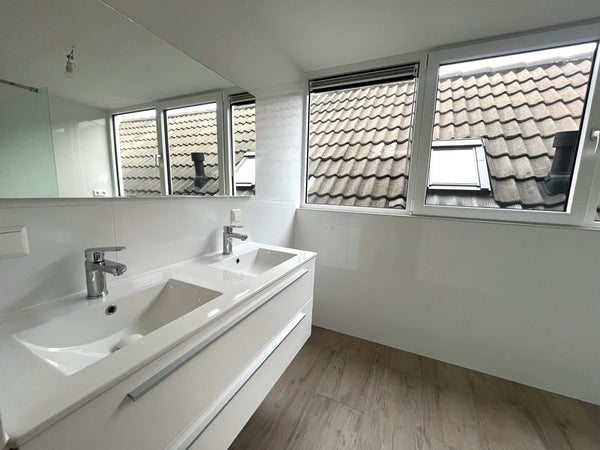 De badkamer beschikt over een douche, een dubbel wastafelmeubel met spiegel, een handdoekenradiator en praktische kastruimte.