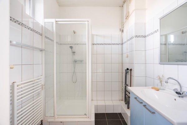 De slaapkamer (ca. 4.46m x 4.21m) is royaal van afmeting en gelegen aan de rustige achterzijde. De badkamer is en-suite en voorzien van is voorzien van een douchecabine met thermostaatkraan, wastafel met meubel en design radiator. Hier is ook de opstelplaats voor de wasmachine.