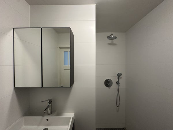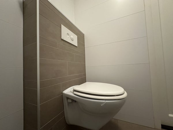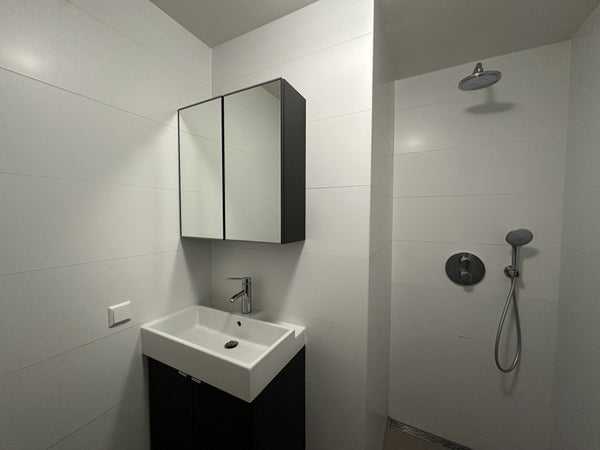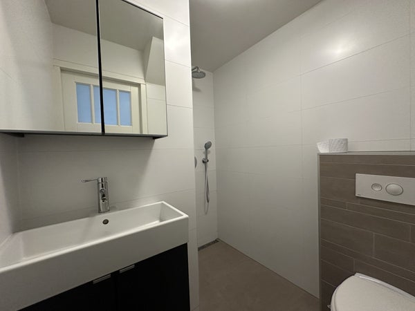 De slaapkamer is gelegen aan de voorzijde van de woning en biedt voldoende ruimte voor een tweepersoonsbed en kledingkast. De moderne badkamer is uitgerust met een inloopdouche, wastafelmeubel en toilet. De woning beschikt over een nieuwe wasmachine.