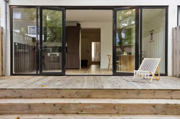 Met een woonoppervlakte van circa 90 m² biedt de woning een prettige en logische indeling. De lichte woonkamer staat in open verbinding met de keuken en de uitbouw, die is voorzien van aluminium kozijnen en dubbel glas.