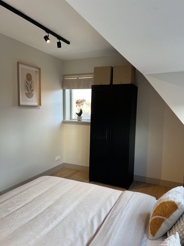 Woonkamer: Royale woonkamer met veel daglichtinval dankzij de grote ramen en openslaande deuren naar een balkon. Inclusief een praktische provisiekast onder de schuine dakpartij