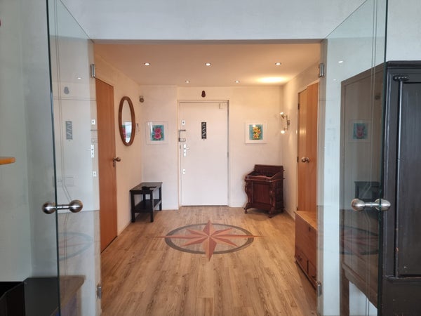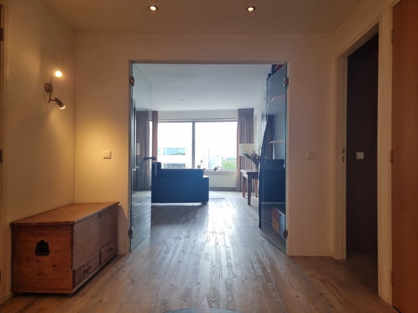 Centrale entree op de begane grond met intercom, bellentableau, brievenbussen en lift. Entree appartement, hal met toegang tot de lichte woonkamer met open keuken. De woonkamer is afgewerkt met een massief houten vloer en dankzij de grote raampartijen geniet u hier van veel natuurlijk licht en een indrukwekkend uitzicht over de Maas en de skyline van Rotterdam.