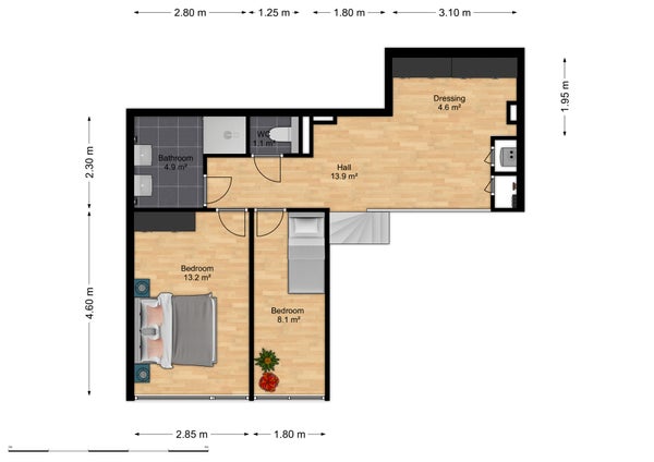 De hoogte van de entresol is ongeveer 2,6m