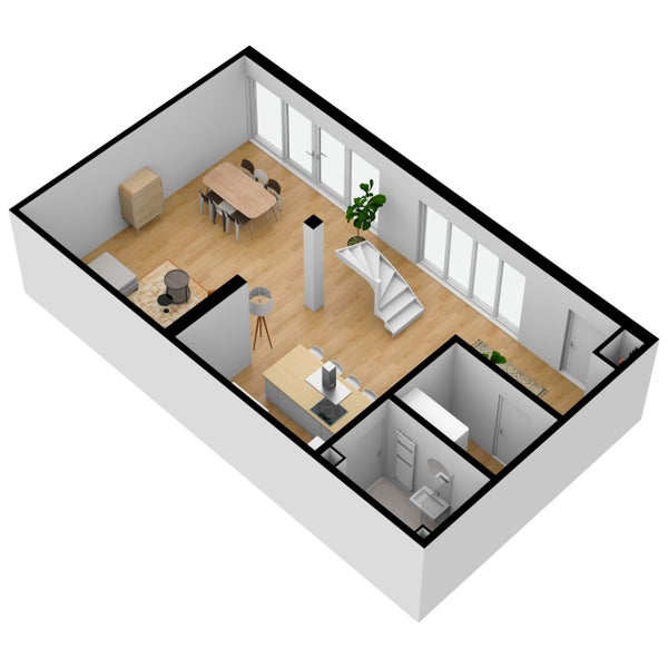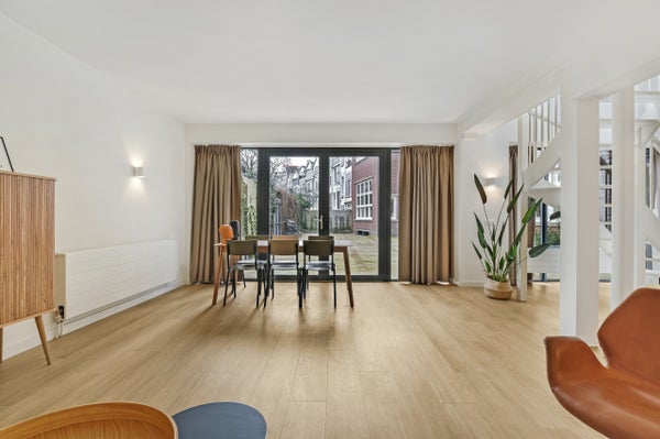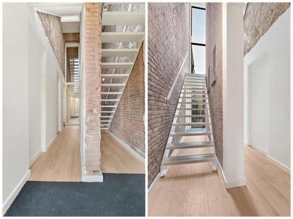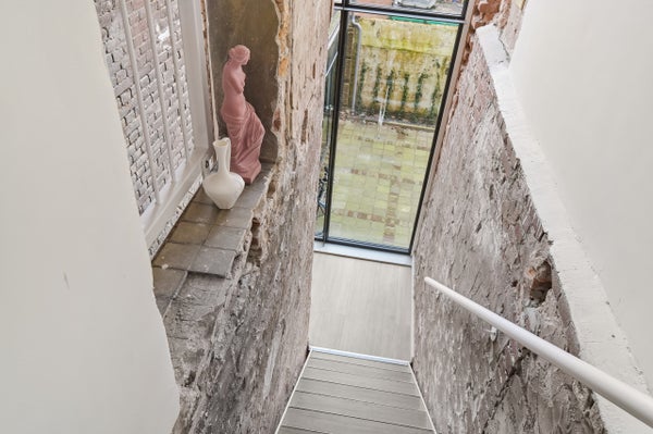 entresol. Entree op de begane grond direct in de keuken met ruim eetgedeelte. Keuken is volledig nieuw met een kookeiland en van alle gemakken voorzien. Hier ook toegang tot het aparte toilet, badkamer en een aparte berging met was/droogcombinatie. Via de keuken ook toegang tot de lichte en ruime woonkamer met lichtkoepel. Via een wenteltrap in de keuken toegang tot de entresol waar 2 ruime slaapkamers zijn gecreerd.