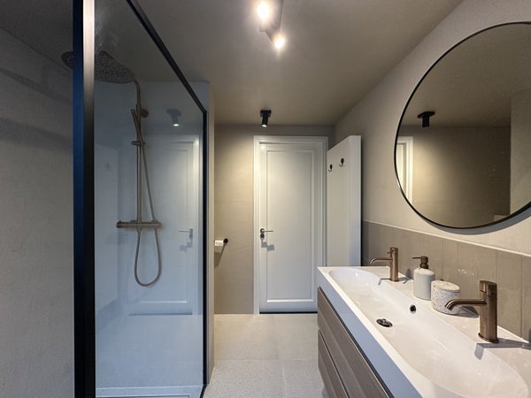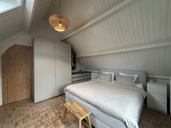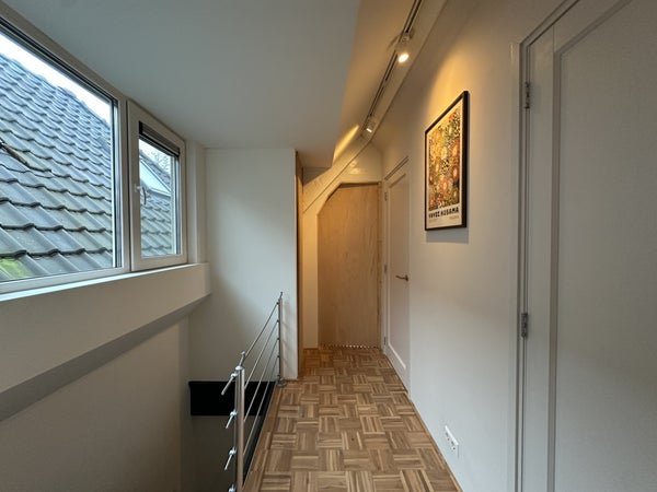 Op de tweede verdieping geeft de overloop toegang tot alle vertrekken. Aan de achterzijde bevindt zich de hoofdslaapkamer met tweepersoonsbed, ruime kastenwand en een vrijstaand bad, met toegang tot het balkon. De tweede slaapkamer ligt aan de voorzijde en is ingericht met een bureau, fauteuil en eenpersoonsbed. De derde kamer is ingericht als werkkamer met ladekasten en een ruim bureau. De moderne badkamer is voorzien van een inloopdouche, dubbele wastafel met meubel en tweede toilet. Op de overloop bevindt zich een ingebouwde kast met wasmachine.