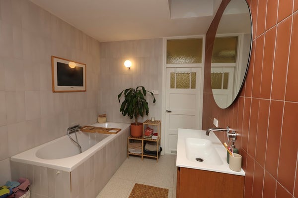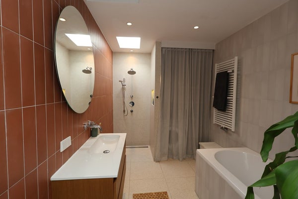 De prachtige badkamer is zeer ruim en luxe uitgevoerd, met hoogwaardige afwerking en moderne voorzieningen.
