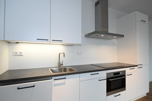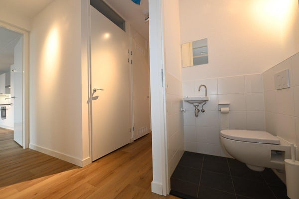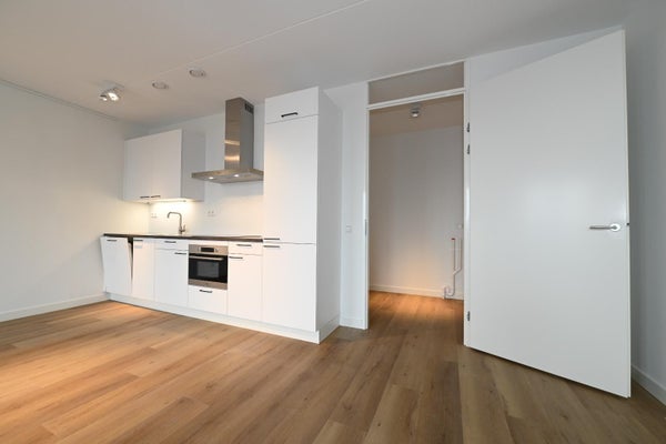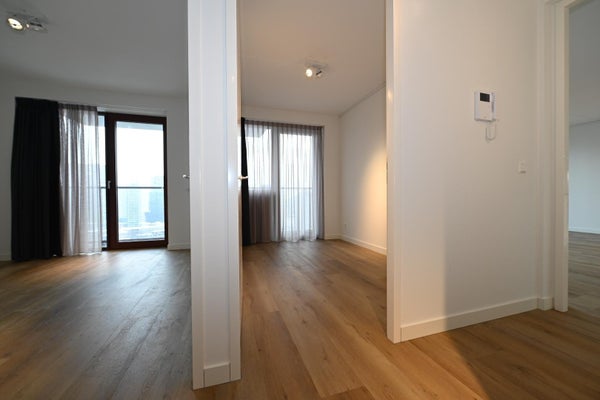 Entree, royale ontvangstruimte met apart toilet, inpandige berging met garderobe, videofoon, deur naar ruime lichte woonkamer van ca. 31 m2 (afm. ca. 5.65 x 5.57 m) , voorzien van een open moderne keuken, uitgerust met koelkast, vriezer, inductie kookplaat, afzuigkap, combimagnetron en vaatwasser. Vanuit de keuken en de woonkamer is er een deur naar het royale balkon van ca. 17 m2 en ervaar je een adembenemend uitzicht over de sfeervolle bruisende stad.