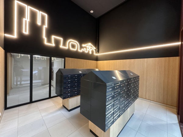 Luxe centrale entree met brievenbussen, videofooninstallatie, liften, trappenhuis en toegang tot de algemene fietsenstalling.