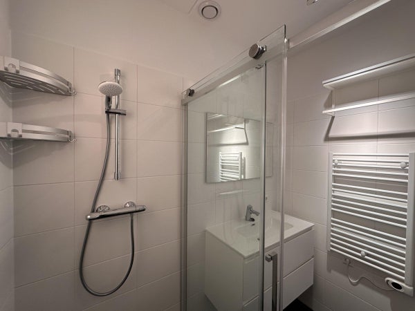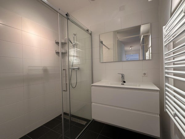 De badkamer is voorzien van een ruime wastafel met lademeubel en spiegel, inloop doucheruimte met glazen roldeur, thermostaatkraan en regendouchekop, een designradiator en mechanische afzuiging. Er is een aparte wasruimte / inpandige berging, die ook dienst kan doen als bijkeuken.