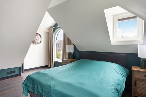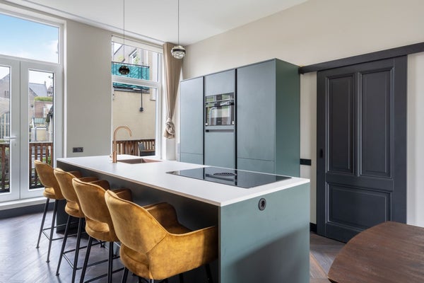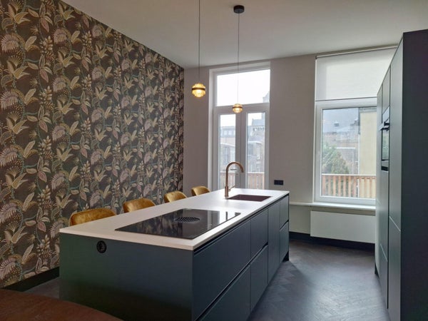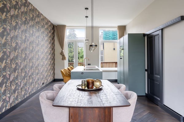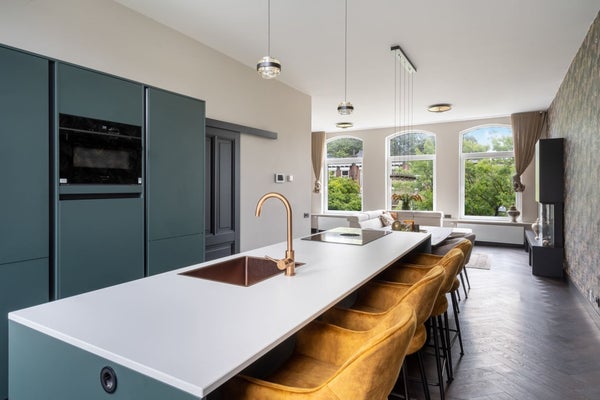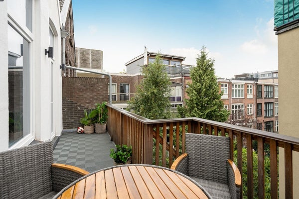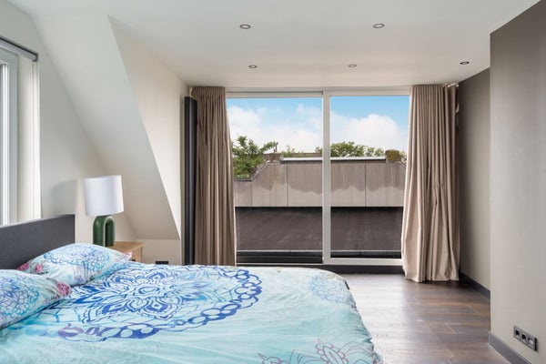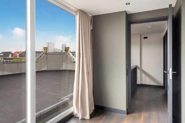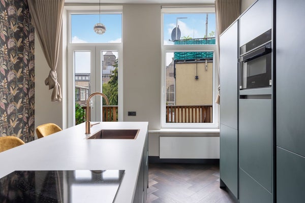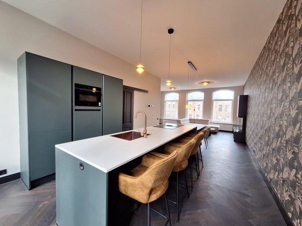 Indeling:2e verdieping: Via de karakteristieke entree bereik je de woning. Hier vind je een stijlvolle woonkamer met visgraatvloer, open keuken met luxe inbouwapparatuur (Bora inductiekookplaat, oven, vaatwasser, koel-/vriescombinatie) en een ruim kookeiland met bar. De openslaande deuren leiden naar het balkon op het westen, perfect voor de middag- en avondzon.3e verdieping: Overloop met toegang tot twee slaapkamers en een luxe badkamer met vrijstaand ligbad, inloopdouche, dubbele wastafel en een extra toilet. De master bedroom heeft prachtige, hoge raampartijen, terwijl de tweede slaapkamer ook royaal en licht is.Een ideaal appartement voor wie op zoek is naar comfort, luxe en een centrale locatie!De huurprijs wordt vermeerderd met ca. €300 voor nutsvoorzieningen (totaal €3245)