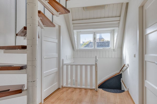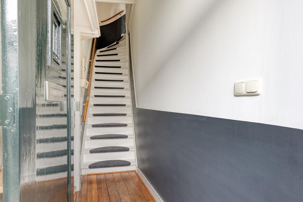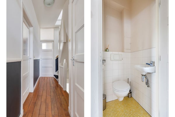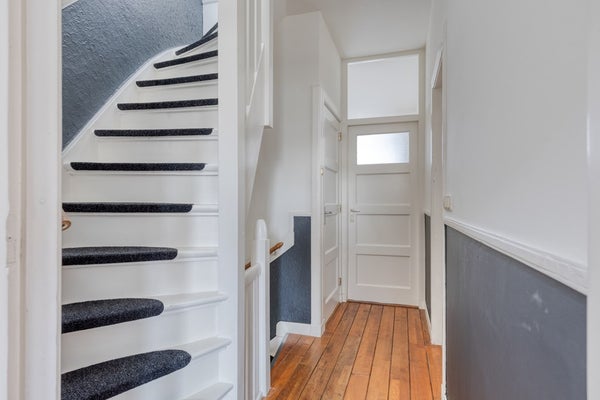 U komt het pand binnen via een privé voordeur. Een trap leidt naar de belangrijkste woonverdieping, waar een lichte hal u verwelkomt. Hier vindt u een toilet voor gasten en toegang tot alle belangrijke kamers.
