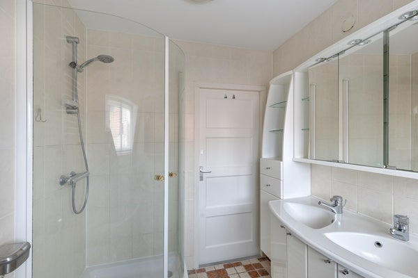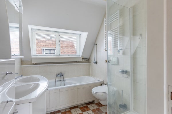 De badkamer is elegant ontworpen met een ligbad, een aparte inloopdouche, een toilet en een wastafel met opbergruimte.