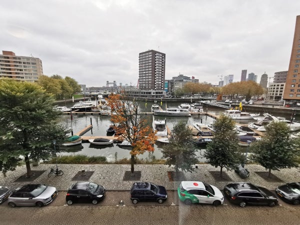 Geniet van een prachtig vrij uitzicht over de Maas, de skyline van Rotterdam en de Admiraliteits Marina vanuit dit lichte en ruime appartement op de derde verdieping.