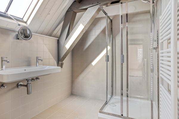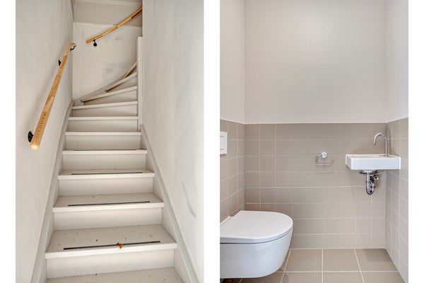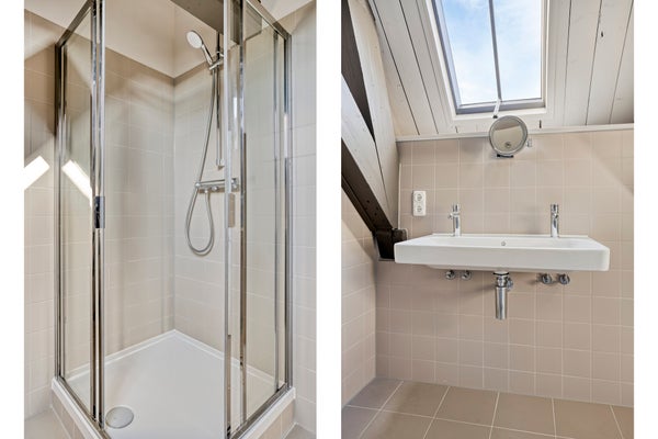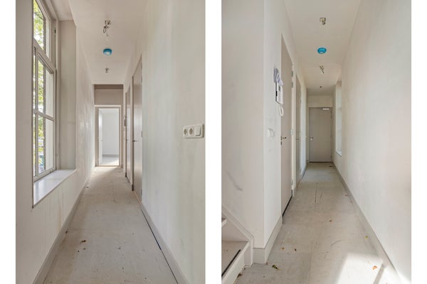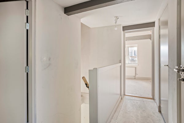 Deze woning van 97 m² ligt op de eerste en tweede verdieping en wordt ontsloten via een gedeeld portiek. Binnenkomst in een lange gang (ca. 7,7 m²), met aangrenzend een toiletruimte (ca. 1,1 m²), de trap naar de tweede woonlaag, en toegang tot de ruime woonkamer (ca. 28,1 m²) met open keuken (ca. 15,7 m²) en een trapkast. Twee openslaande deuren bieden vanuit de woonkamer toegang tot een eigen dakterras van ca. 26,1 m². De verdieping, gelegen in de kap, bestaat uit een overloop (ca. 4,1 m²) met aangrenzende toiletruimte (ca. 1,4 m²), een washok (ca. 1,8 m²) met aansluitingen voor wasmachine en droger, een badkamer (ca. 5,1 m²) met inloopdouche en dubbele wastafel, en twee slaapkamers van respectievelijk ca. 19,4 m² en 12,4 m².