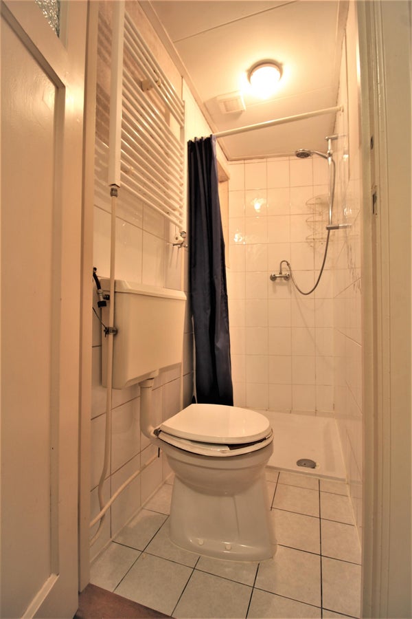 De badkamer is voorzien van inloopdouche, toilet en handdoekradiator.