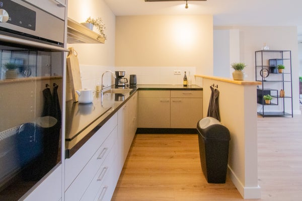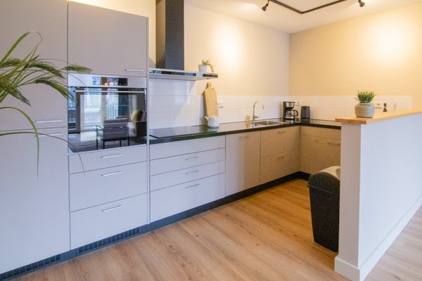 De woonkamer is zeer ruim te noemen en van alle gemakken voorzien. De open keuken heeft verschillende inbouwapparatuur waaronder een inductiekookplaat met afzuigkap, koel-vries combinatie, combi-oven en vaatwasser.