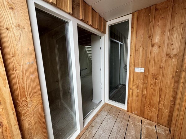 Tussen de patio en de woonkamer zit de toiletruimte en de wasruimte met de elektrische boiler