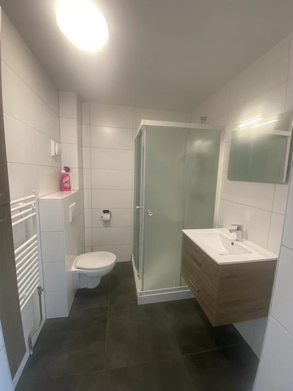 Voorzien van 1 slaapkamer en een moderne badkamer voorzien van een zwevend toilet, wastafelmeubel en een douche.
