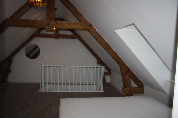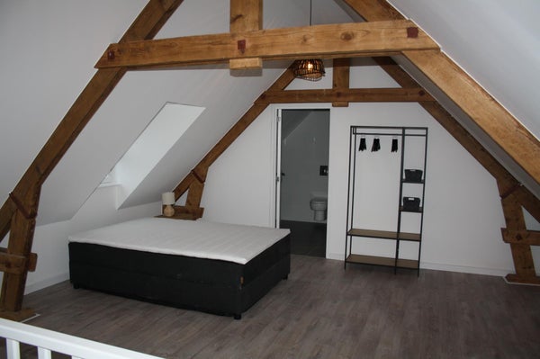 Slaapkamer (4.15x 6.30) met oude spanten en toegang tot de moderne badkamer (circa 2.42 x 2.50) met douche voorzien van douchecabine, wastafel met badmeubel, toilet en wasmachine aansluiting.